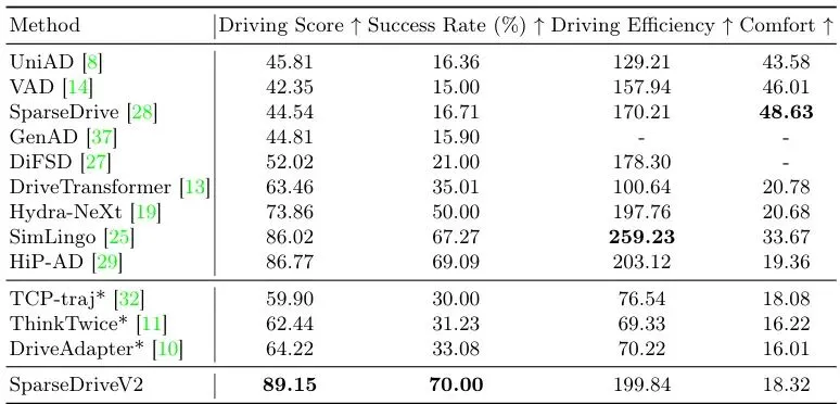 在更具挑战性的闭环仿真基准Bench2Drive上(见表4),SparseDriveV2同样表现优异,获得了89.15的驾驶分数(Driving Score)和70.00的成功率(Success Rate),在所有对比方法中名列前茅。