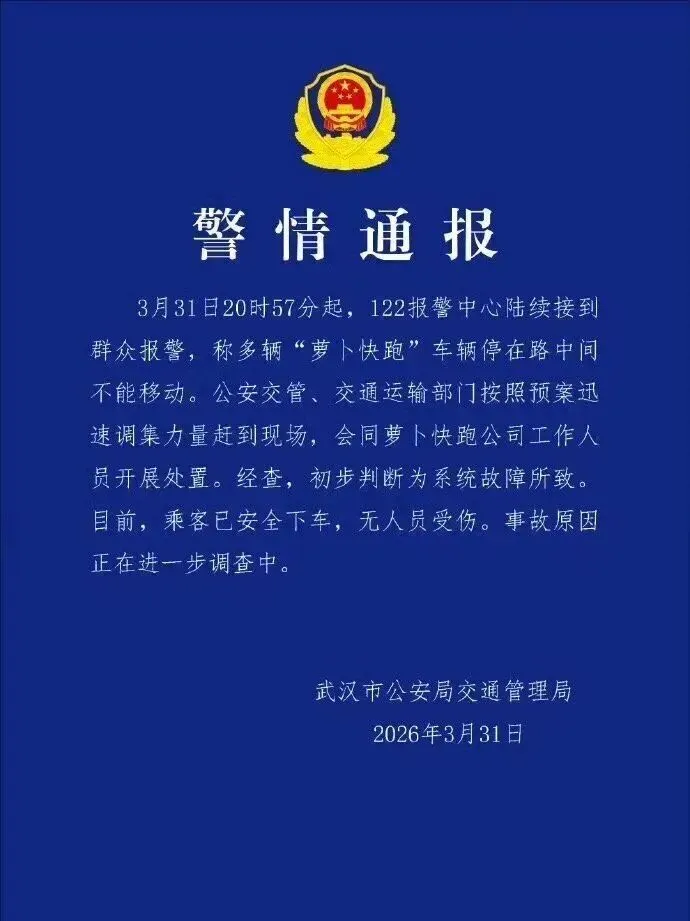 截至4月1日凌晨,武汉市公安局交通管理局发布警情通报,初步判断为系统故障所致,乘客已安全下车,无人员受伤,事故原因正在进一步调查。