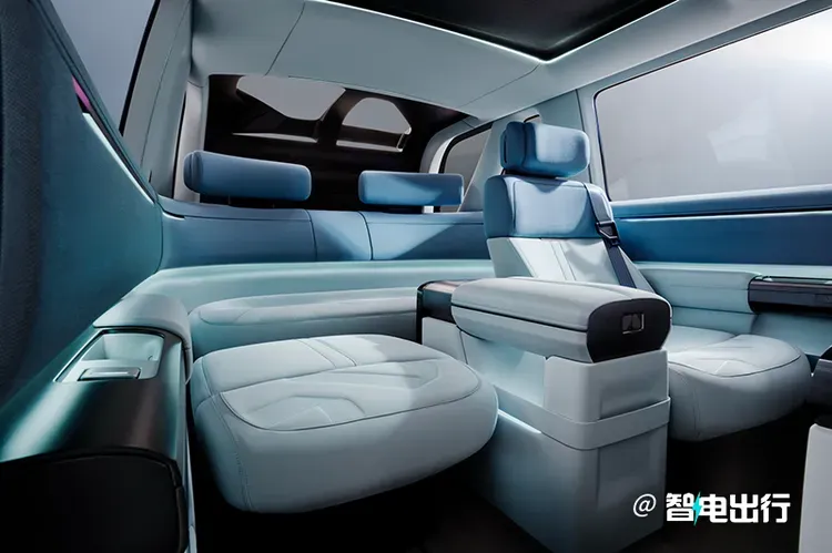 一般来说,二排的右边都是老板位,但是从概念车来看第三排的环抱式沙发才是重点,加上第二排的脚踏直接变成了个大躺椅。