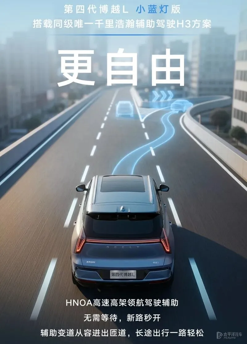 作为新车型的核心升级,第四代博越L小蓝灯版搭载同级唯一的千里浩瀚辅助驾驶H3方案,配备3颗毫米波雷达、11颗高感知摄像头及128TOPS高算力芯片,实现360°无死角感知。支持高速NOA领航辅助,采用纯视觉无图方案,覆盖全国38万公里高速和3万公里高架路段,开箱即用无需等待开城。
