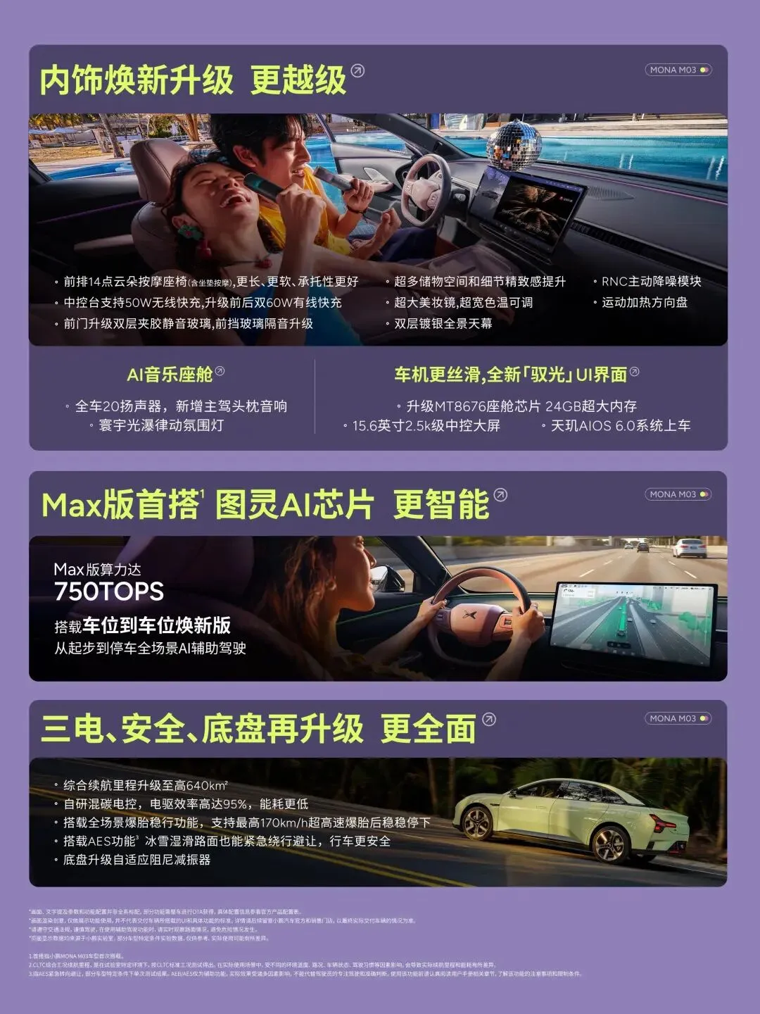 2026款MONA M03搭载了小鹏自研的混合碳化硅扁线电驱系统,百公里综合电耗最低10.8kW,