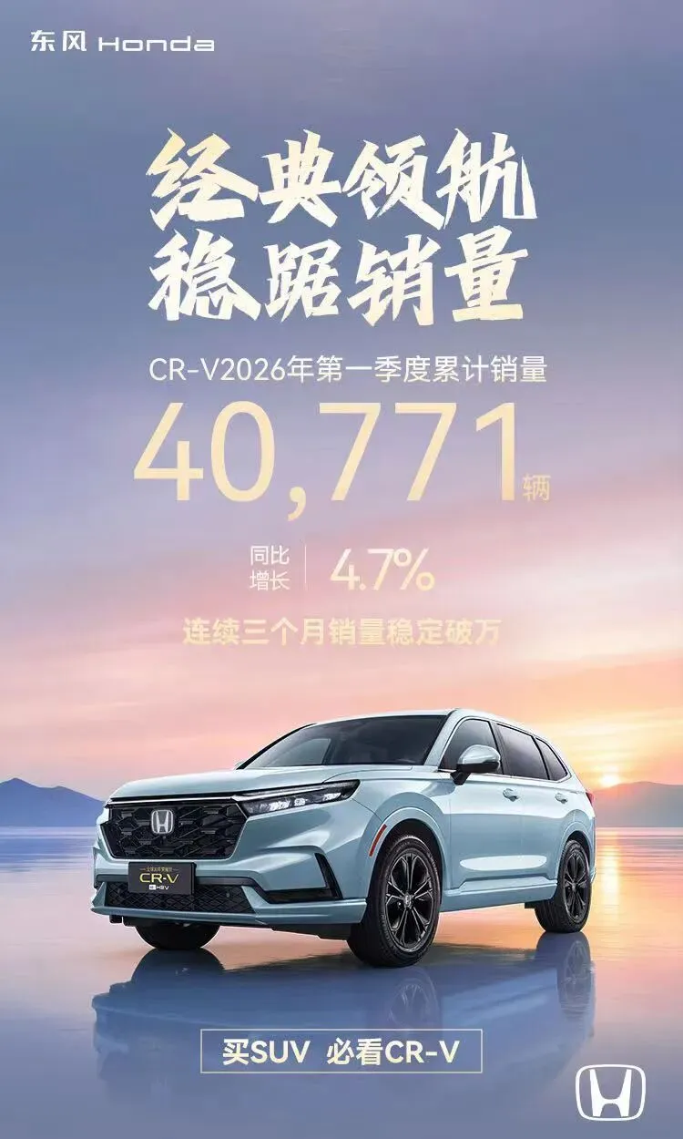 今年业界共识清晰:车企需从简单的“价格战”转向更注重消费者获得感的“品质战”“价值战”,聚焦为用户提供更优质的出行体验。当下,注意力资源越发稀缺,即便技术日新月异、新品与概念层出不穷,大浪淘沙后能持续热销的产品仍寥寥无几,新车保鲜期越来越短,也让消费者在购车时难免产生焦虑。在面对不确定性的忧虑中,那些品质始终如一,技术与时俱进的“长跑型”选手更加受到市场青睐。中汽协数据显示,2026年1月,国内汽车销量同比下降13.9%,然而,传统燃油车同比下降10%,降幅小于大盘,实力派车型逆势而上,走出了漂亮的反弹曲线。老将东风本田CR-V,1月和2月分别以36.4%和13.2%的同比增速,以1月销量19141辆,2月销量10102辆的硬核成绩,走出了漂亮的开门红,并在刚刚结束的一季度,售出40771台,同比增长4.7%,连续三个月单月销量突破万台大关,尽显13万级合资家用SUV的硬核实力。