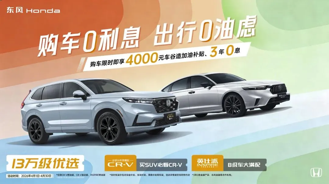 限时政策助力,让高品质出行触手可及。即日起至4月30日期间,购买CR-V指定车型限时可享4000元车谷造加油补贴及3年0息的金融政策,降低购车门槛,让更多用户轻松拥抱高品质出行生活。