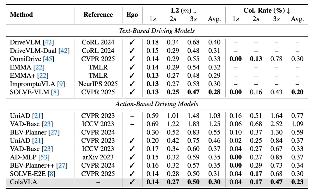 在 nuScenes 的开环评测中,ColaVLA 在动作类方法里取得了最优综合表现,平均 L2 误差为 0.30 m,平均碰撞率为 0.23%。相比强基线 SOLVE-E2E,L2 进一步下降,碰撞率也明显降低。