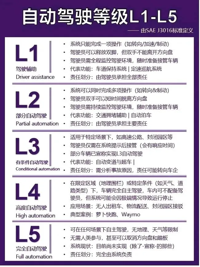 L2,你现在大多数新能源车上都有——辅助驾驶,车道保持、自适应巡航、自动跟车。但核心是:方向盘背后的责任始终是你的。系统只是在帮你,出了事,是驾驶员的责任。
