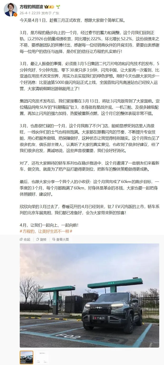 结合4月1号,方程豹熊甜波总在微博上说的,近期会邀请朋友看方程豹轿车,做一些沟通。B站网友爆料的图片有一定可信度。