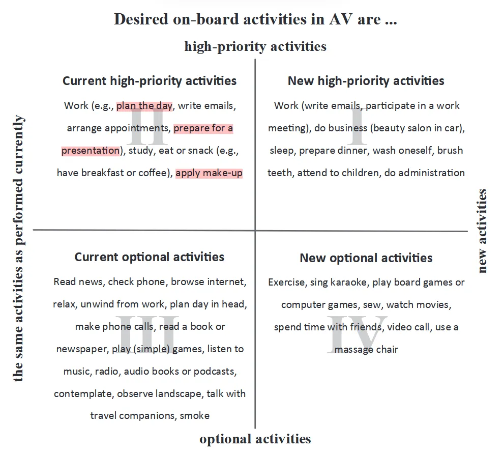 作者提出了一个很有启发性的分类框架,按“是否为新活动”和“优先级高低”两个维度,把人们想在自动驾驶车内进行的活动分为四类: