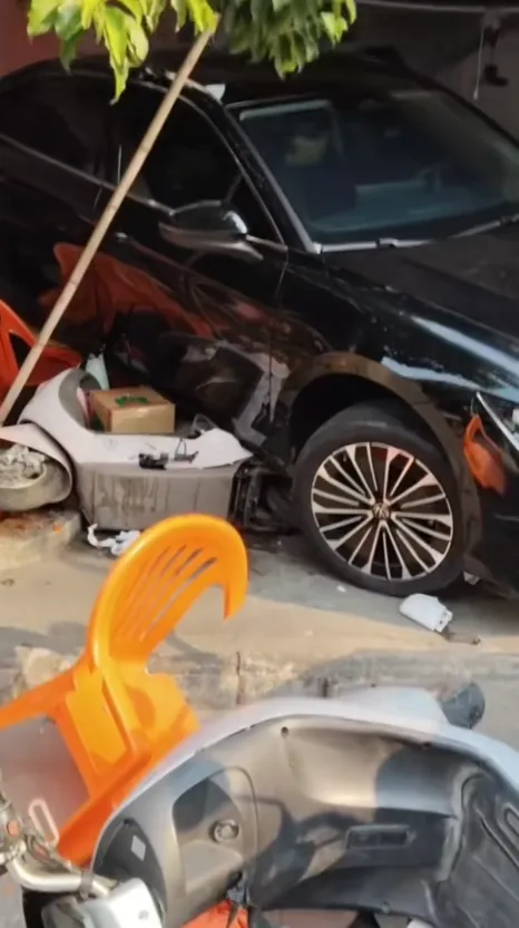 据了解,涉事男青年为新手驾驶员,驾驶刚购置的黑色轿车行驶至该路段,为避让前方对向驶来的小汽车,随即向后倒车。该男子因驾驶经验不足、情绪慌乱,误把油门当成刹车猛踩,车辆瞬间向后猛冲。失控轿车接连撞倒十余辆摩托车,随后径直撞进老爸茶店。事故导致两名正在就餐的老人被撞倒受伤,店内部分桌椅、餐具被撞损,涉事轿车及多辆摩托车均有不同程度损坏。该男子的家人同乘车上,所幸均未受伤。