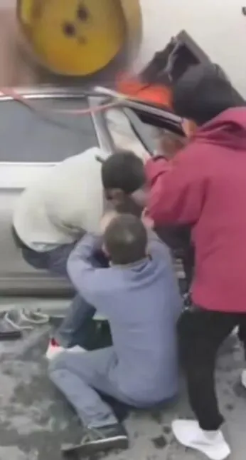 李先生的妻子用手机记录下现场的情景。货车司机也受伤了,头上有血。轿车车头已经蹿出火苗,驾驶室内已冒起浓烟,三四名过路司机拿来灭火器不停地朝轿车喷。起初车门打不开,李先生还取来铁锹试图破窗但没能成功,他又用铁锹撬门,最后李先生等三人合力将副驾驶门拉开。门被拉开的时候,驾驶室已经着火了,火苗呼呼地往外蹿。几人用小刀割断了副驾驶乘客的安全带,将乘客拖了出来。获救时,乘客裤腿已经烧着了,几人赶紧用水往乘客身上浇。