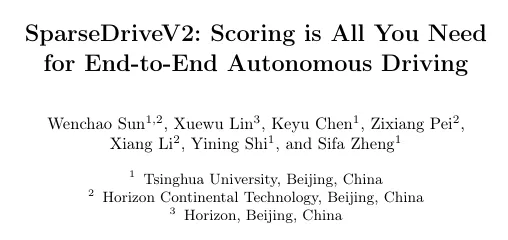 - 论文题目:SparseDriveV2: Scoring is All You Need for End-to-End Autonomous Driving(《评分即核心:端到端自动驾驶的超密集静态词汇规划方案》)