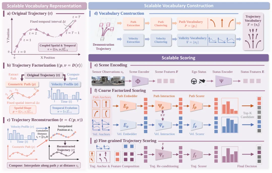 - 轨迹词汇:路径与速度的全组合形成 (1024×256=262,144) 个轨迹候选,密度为传统方法(8192个)的32倍,且词汇规模可通过调整路径/速度锚点数量灵活扩展。