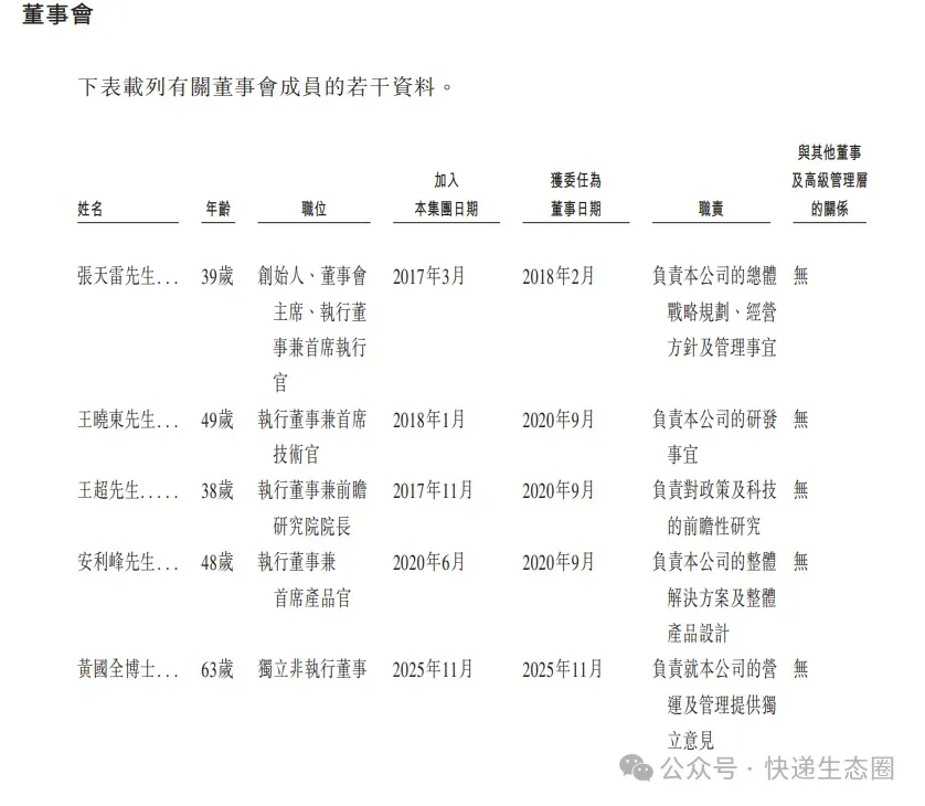 王晓东,49岁,执行董事兼首席技术官,主要负责本公司的研发事宜。王先生于2018年1月加入本公司,并主要负责研发工作。他自2020年5月起担任本公司研发中心负责人,并相继于2020年9月及2025年11月进一步获委任为执行董事及首席技术官。加入本集团前,王先生于1999年至2017年期间从事公务工作。王先生于2006年7月取得中国清华大学计算器科学与技术硕士学位。