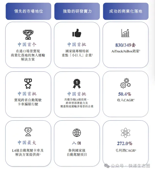 截至2025年12月5日,公司已累计交付830辆AiTruck及349套AiBox,并获得821套AiTruck及920套AiBox的意向订单。根据弗若斯特沙利文的资料,按2024年的产品销售收入计,公司是封闭道路场景下中国规模最大的L4级自动驾驶卡车及解决方案提供商。