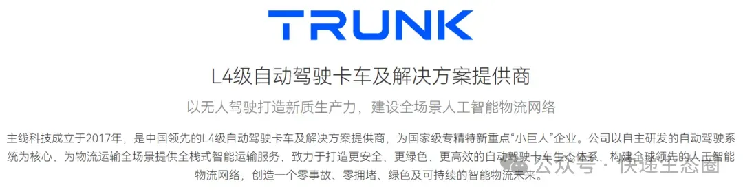 主线科技招股书显示,主线科技是一家L4级自动驾驶卡车及解决方案提供商。公司以自主研发的自动驾驶系统为核心,构建了“车-端-云”一体化的产品生态系统,为物流运输全场景提供全栈解决方案。