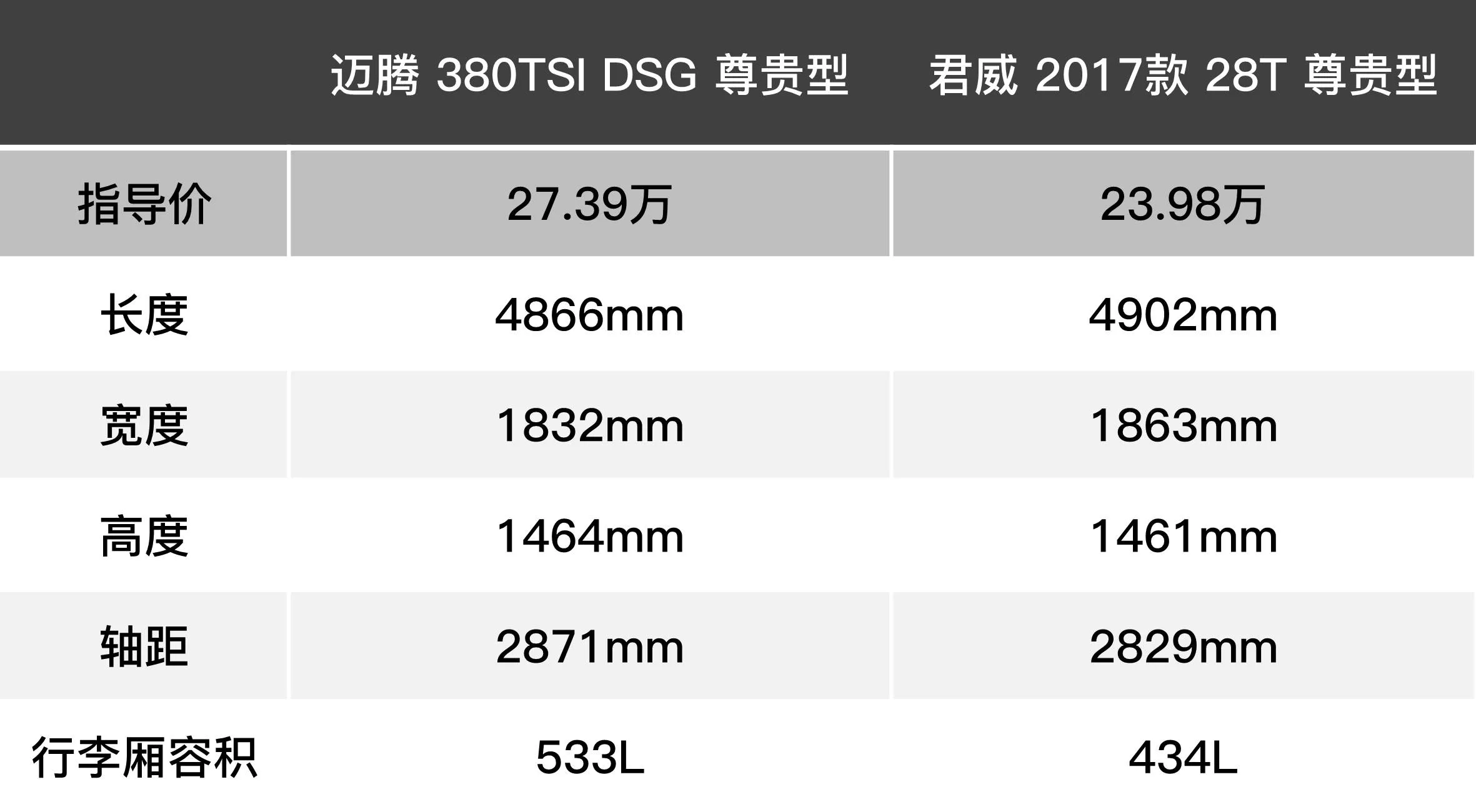 于是,老周带着两款备选车型(售价27.39万的迈腾380TSI尊贵型与售价23.98万的新君威28T尊贵型),分别走进了一汽大众和上汽通用别克的4S店,开始一场更深入的两车对比!