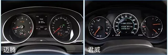 除了软包面积比较大以外,君威的仪表盘也比较讨喜老周。这不难理解,君威的仪表盘超过一半面积采用液晶显示,液晶屏部分还能在“模拟数字表盘”和“纯数字显示”两种模式中切换。迈腾的仪表沿用了上一代车型的,看起来确实比较缺少亮点,虽然它还有更牛X的全液晶仪表盘,但是这些都得选装,都是Money啊~