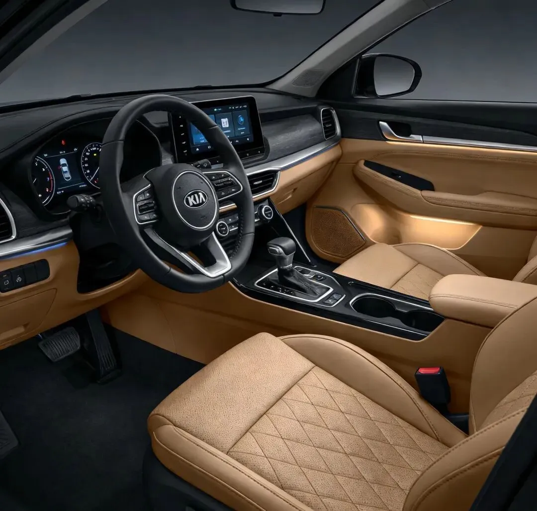 进入座舱,起亚狮铂拓界以“全员舒适”为核心,打造温馨实用的驾乘环境。环抱式中控台向主驾倾斜,操作顺手且行车更安全。大面积软性材质包覆,搭配木纹、金属拉丝饰板与细腻缝线,触感温润、做工扎实,没有廉价塑料感。双12.3英寸全景曲面连屏是座舱核心亮点,全液晶仪表与中控屏显示清晰、操作流畅,搭载ccNC智能互联系统,支持无线手机互联、语音控制、在线导航、车载微信、OTA远程升级,语音指令识别准确,可控制空调、车窗、音乐、导航,开车不用低头分心。