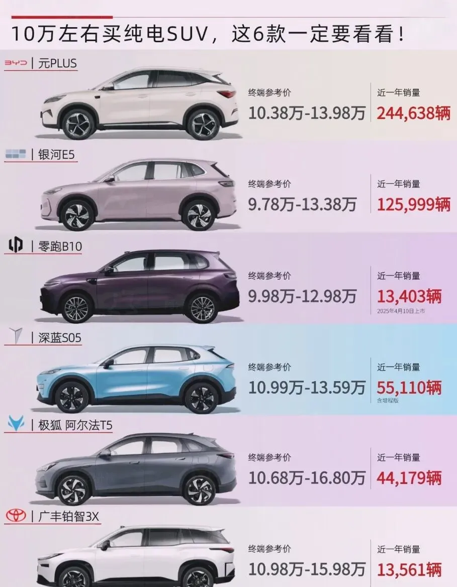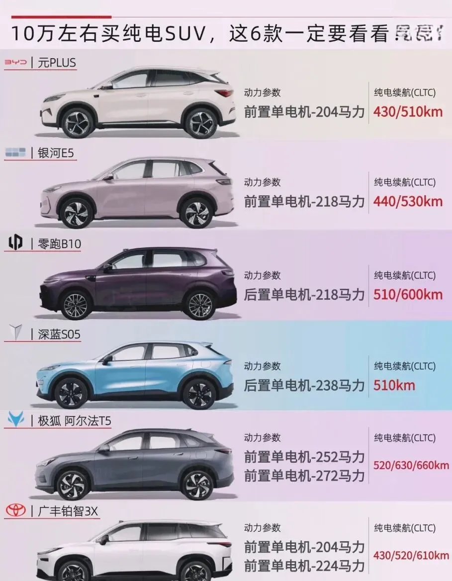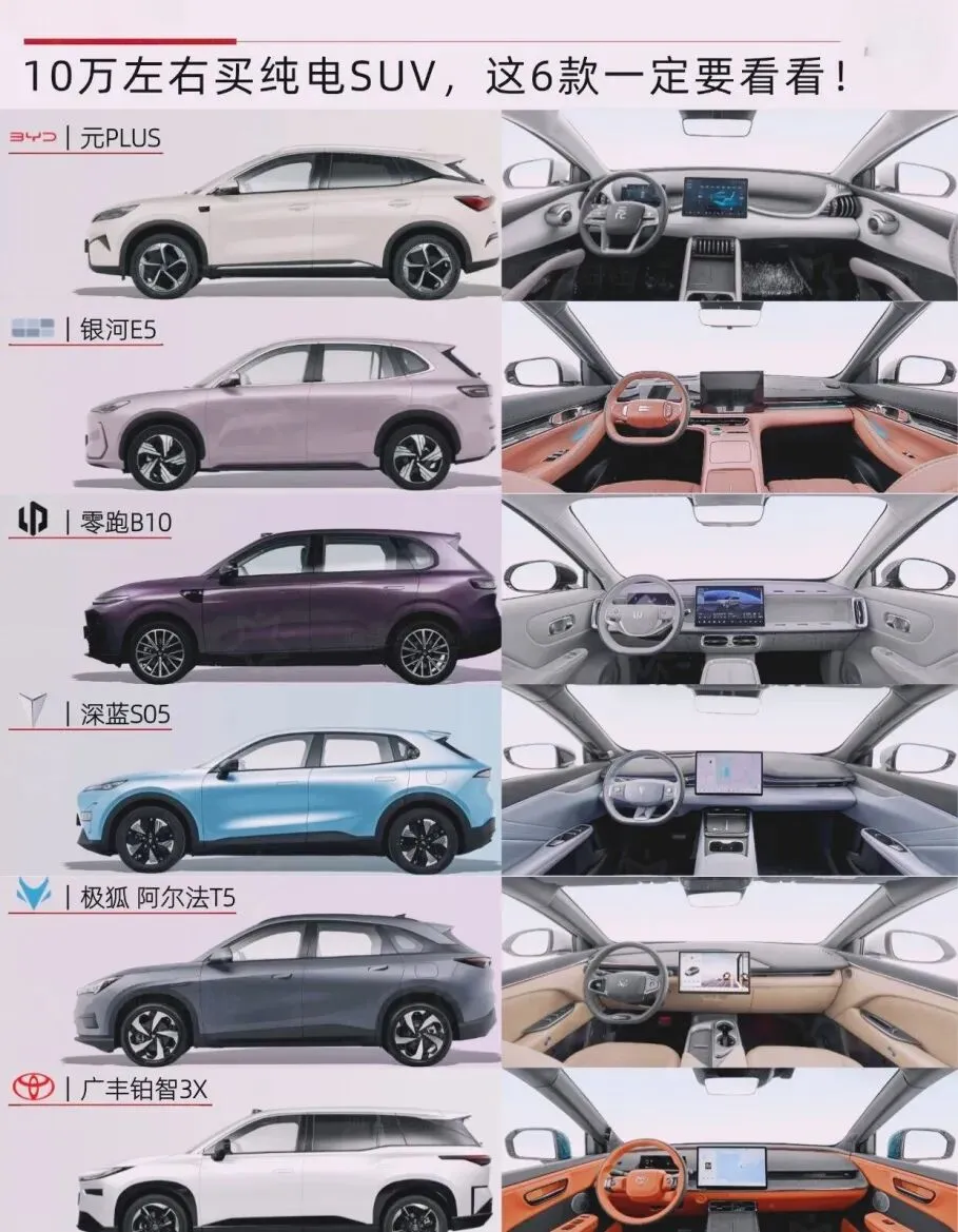 预算10万左右想买纯电SUV,不知道怎么选?今天整理了6款高性价比选手,优缺点全透明,刚需代步、家用通勤都适配,选车再也不纠结!