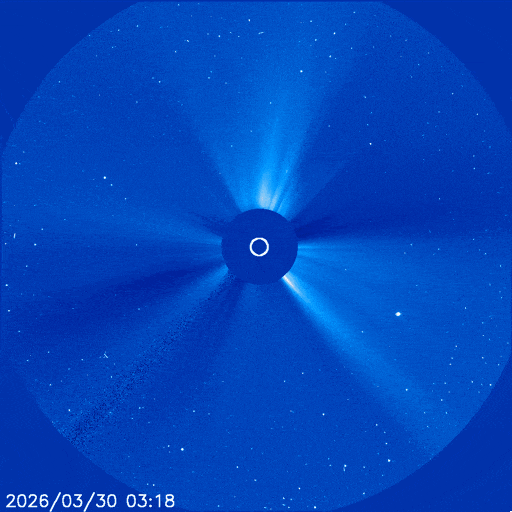 这其实是一个常见的误区。虽然第 25 太阳周期的峰值出现在 2024 年底到 2025 年间,但太阳并不是到了峰值就瞬间“熄火”。虽然太阳活动整体已从高峰期回落,但仍可能出现强爆发事件,如2026年2月的X4.2级耀斑。但由于整体背景活动减弱,这些偶发的强事件在空间天气影响上可能显得更加突出和难以提前精确预报。太阳活动周期 F10.7厘米射电通量演变图 | 图源:NOAA简单来说,太阳的活跃来自于其磁场的演化。我们肉眼所见太阳表面及大气的几乎所有特征,全都离不开磁场的作用。太阳黑子,是强磁力线冲破太阳表层形成的区域。太阳黑子的活动周期,源自太阳内部物质运动对磁场的周期性重塑。悬浮在太阳表层上方的日珥,依靠磁场支撑并被磁力线贯穿。日冕里随处可见的流束与环状结构,同样由磁场塑造而成。这是由于太阳不是一个固态球体,而主要由等离子体(带电的氢和氦)构成。它不同纬度的自转速度不同(赤道快、两极慢),使得磁场被不断缠绕、拉伸。当这些强磁场区域(如黑子群)中的磁能积累到临界状态,磁重联过程被触发,瞬间释放巨大能量,表现为耀斑和日冕物质抛射等现象。耀斑作为瞬间发出的“亮光”,8分半钟即可抵达地球。而日冕物质抛射(CME)则是太阳“吐”出一大团带电粒子,一般要跑个两三天。为什么CME这么"慢"?虽然CME的爆发速度可达每秒数千公里(最快记录超过3000 km/s),但相比光速仍然慢得多。我们可以来算一算:计算:150,000,000 km ÷ 500 km/s ≈ 83小时(约3.5天)因此,"8分钟的光" vs "两三天的风",这就是空间天气预报的关键窗口期。日冕物质抛射通常与太阳耀斑和日珥爆发相关,但并非必然绑定,它也可能在这两种现象均未出现的情况下发生。最近发生的这次 X1.4 级耀斑就伴随了日冕物质抛射。虽然爆发位置在太阳的东南侧,不是“正对着”地球,但产生的带电粒子流仍可能掠过地球。国家空间天气监测预警中心预报:3月31日至4月1日,地球可能发生较强地磁暴。SOHO对此次日冕物质抛射的监测 | 图源:SOHO但大家最关心的可能是——这和我们人类到底有什么关系?