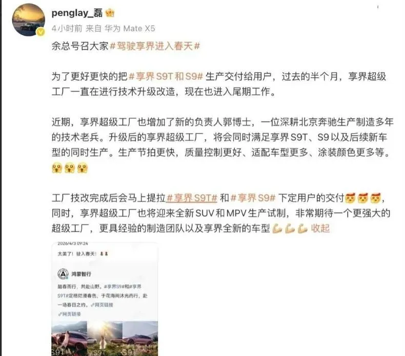 4月3号,彭磊在微博发了两条消息,配图是两张没贴标的新车,一张方盒子带轮眉,一张侧滑门配双色车身。没提名字,没写参数,就一句话:“享界,开始了。”底下评论炸了,有人截图发到车友群,说“这回真不玩虚的”。我蹲了三天发布会直播回放,翻了北汽顺义工厂4月2号的公示文件,又对比了鸿蒙智行官网刚更新的配置表——不是预告,是真量产,今年三季度试装,明年一季度交付。