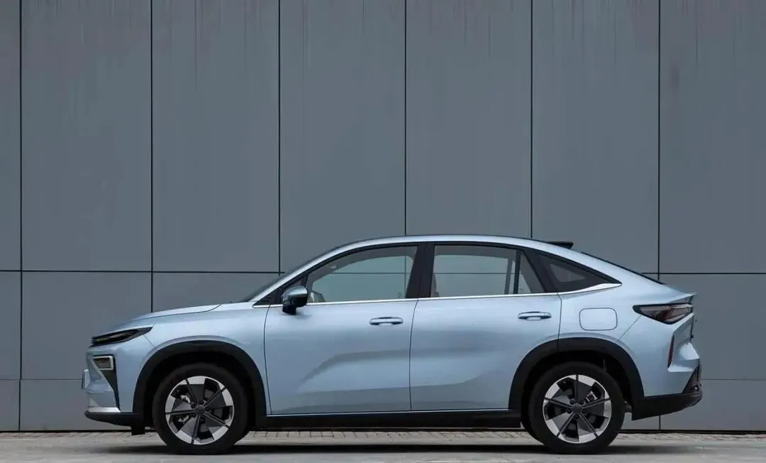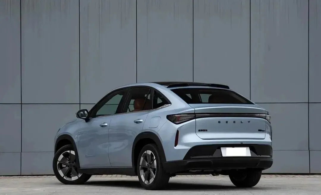 再来看车身侧面部分,博越REV采用标准紧凑型SUV比例,车身尺寸4670mm×1900mm×1705mm,轴距2777mm,修长的车身线条搭配流畅的车顶弧度,从B柱开始缓慢下压,营造出略带溜背的动感姿态,同时不牺牲后排头部空间。车门采用隐藏式门把手设计,降低风阻的同时提升科技感;车身腰线采用双段式设计,上腰线从前翼子板贯穿至车尾,下腰线则强化侧面层次感,搭配黑色轮眉与侧裙护板,凸显 SUV 的越野属性。车窗边框辅以镀铬饰条包裹,C 柱位置加入专属 “REV” 混动标识,彰显车型身份,整体侧面设计简洁大气。