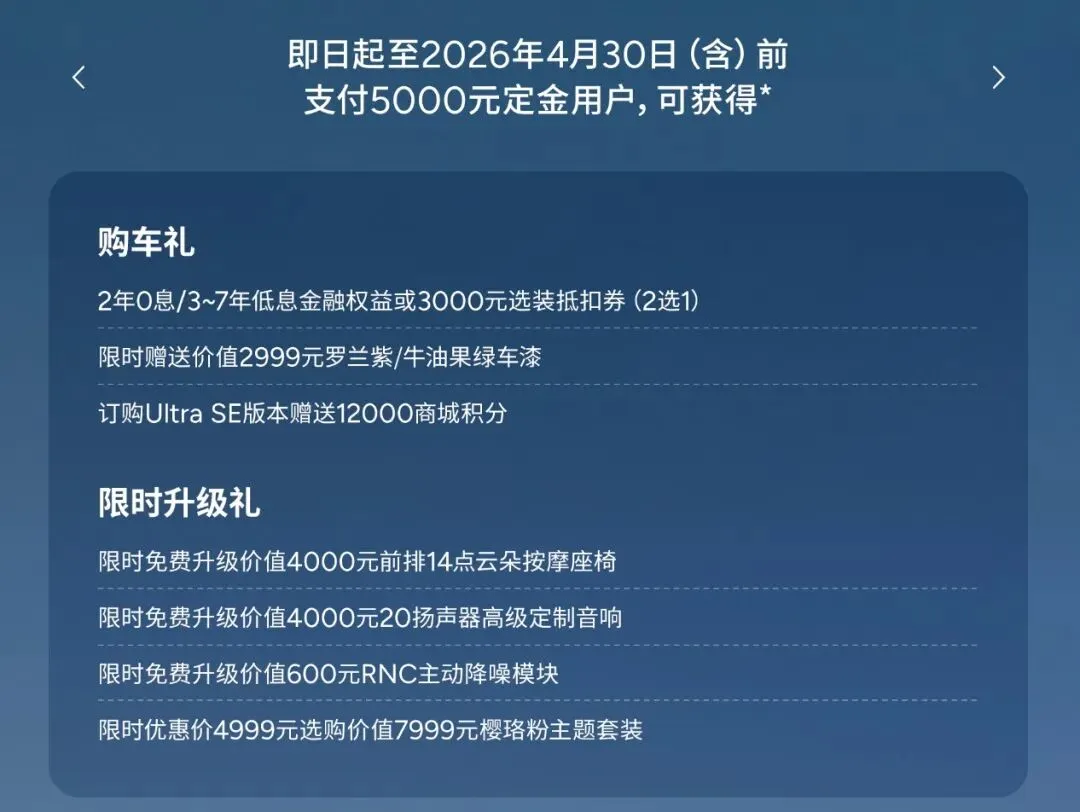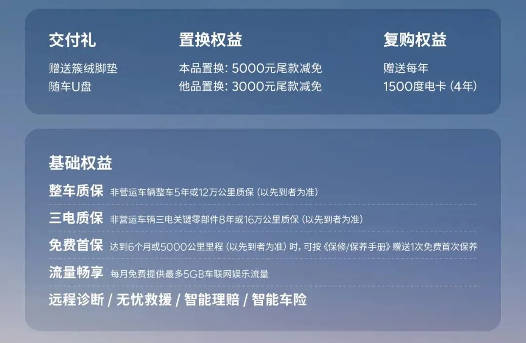 新车6款版型,Plus、Max、Ultra SE三种配置,各自又有长续航和超长续航两种续航可选,三种配置在舒适性体验方面基本无差异,主要区别在智驾方面。追求性价比,可考虑510长续航Max版,12.98万能买到,配置充足;对智驾有更高要求,那就在两款Ultra SE中选,就智驾能力来说,M03就是同级数一数二的。如果你现在下定,还能薅到价值超3.5万元的权益羊毛,这波福利是挺大的,并且也覆盖了各方面。