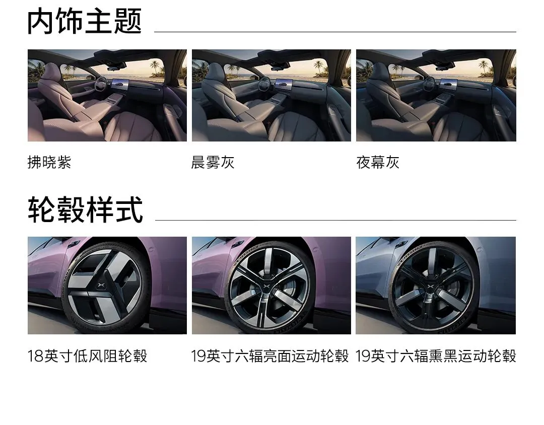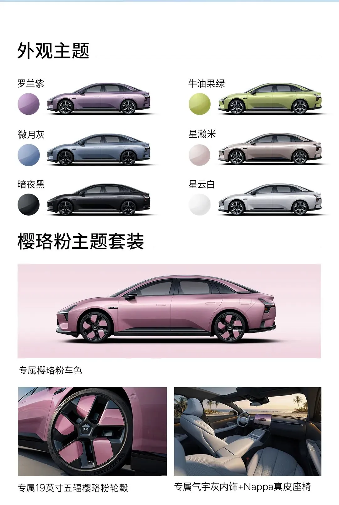 外观颜色、轮毂样式以及内饰主题见上图,目前只有樱珞粉主题套装是需要花4999元选装的,其余颜色和内饰搭配都是免费的。