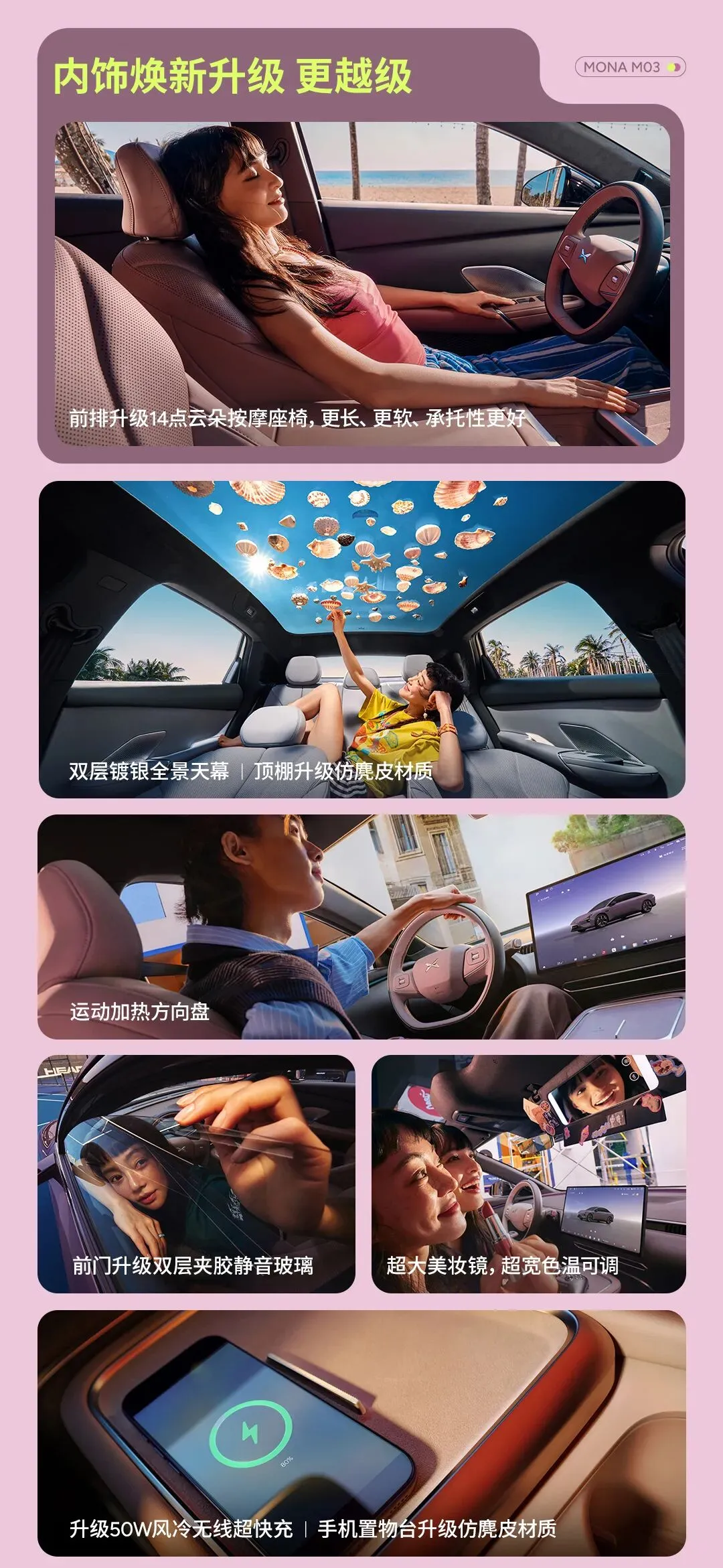 这车长得很年轻,也有很多细节提升。新颜色: 新增了罗兰紫和牛油果绿,清新又吸睛;内饰还有樱珞粉套装,连轮毂和座椅都是专属定制的,简直是把劳斯莱斯的工艺搬到了十几万的车上。