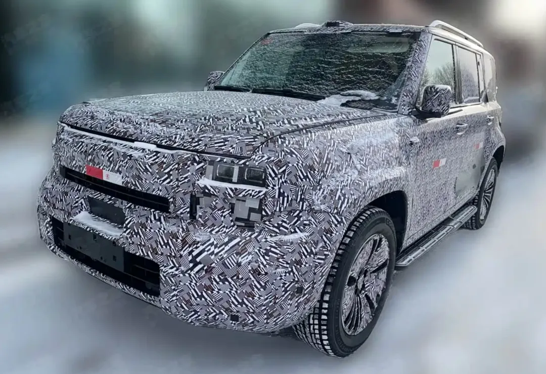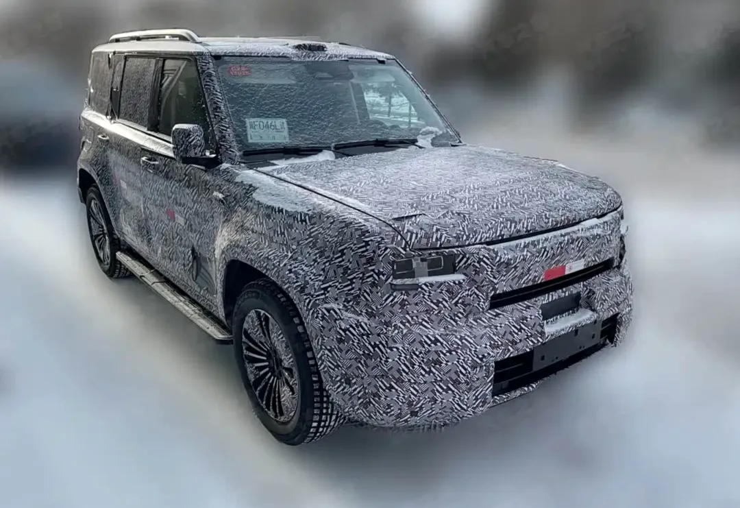 从谍照图来看,新车采用方盒子造型,可见其定位将是硬派越野。前脸采用半封闭式隔扇设计,两侧采用矩阵式大灯组,前挡风玻璃顶上配备有激光雷达,两边前翼子板的位置也有摄像头,意味着新车将配备高阶智能驾驶辅助系统,同时车顶还配备有行李架。