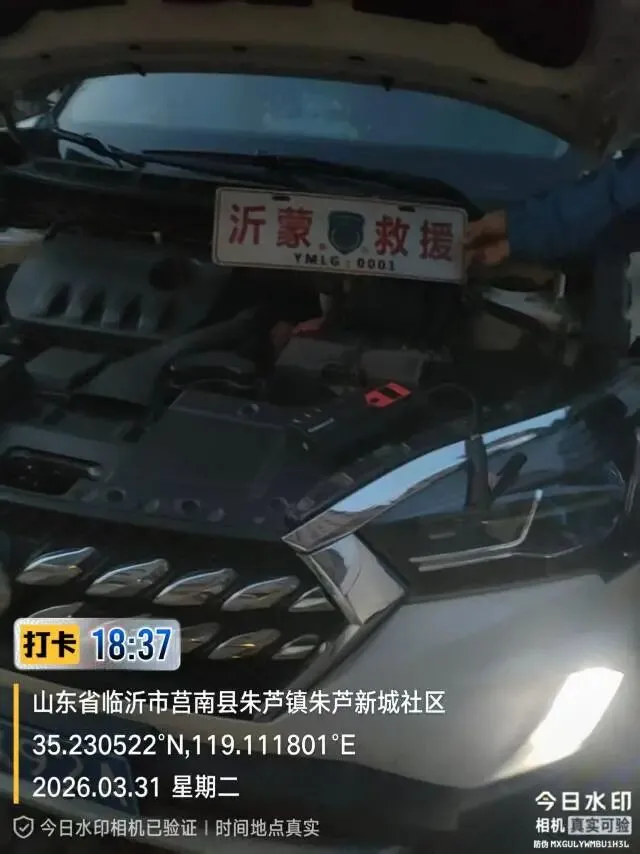 2026年3月31日晚上,沂蒙救援临港大队接到救援电话,在临港区朱芦镇朱芦新城区一辆轿车电瓶亏电,需要联电救援。沂蒙救援临港大队队长孟庆团及时赶到,联电启动车辆,成功救援。