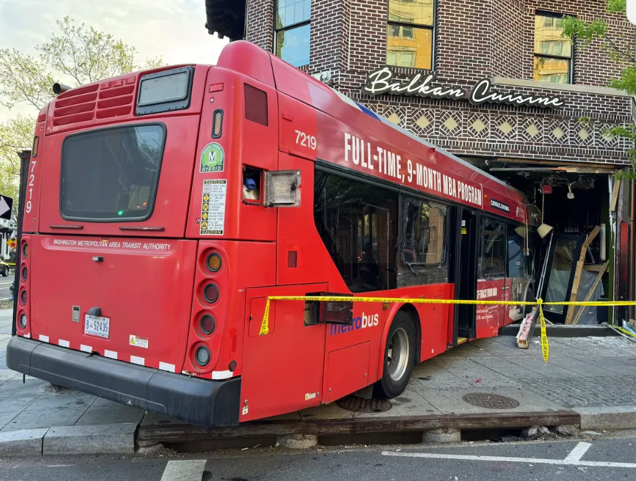 根据消防部门通报,事故发生在 西北第七街与 Q Street NW 路口,时间约为当天早上 7 点多。救援人员赶到现场后发现,这辆巴士先与一辆 SUV 发生碰撞,随后直接撞进街角的 Balkan 餐厅 Ambar。从现场画面来看,整辆巴士车头几乎半个身子都冲进了店内,场面相当惊人。