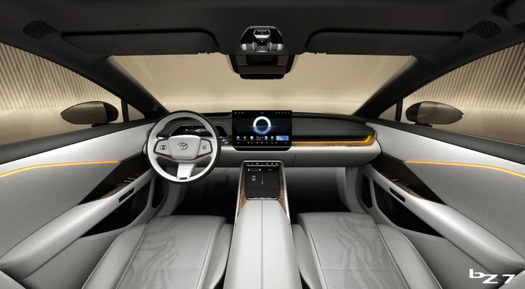 bZ7的座舱能明显感受到丰田在智能化和豪华感上的突破。内饰采用极简科技化设计,中控台几乎取消了传统实体按键,大部分功能整合进15.6英寸中控屏,搭配全液晶仪表和抬头显示系统,科技氛围拉满。
