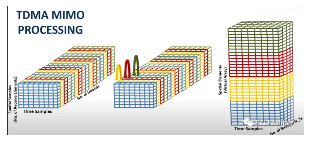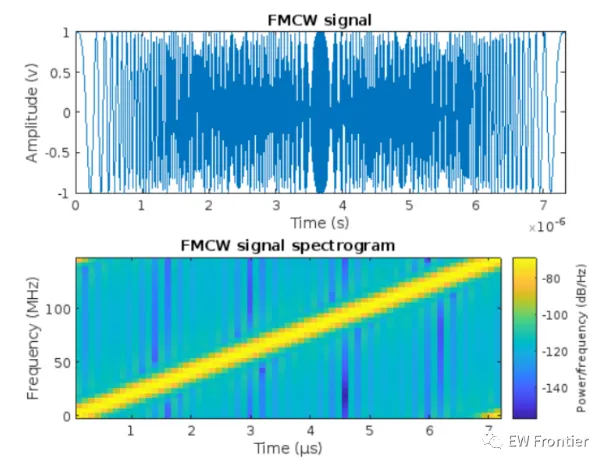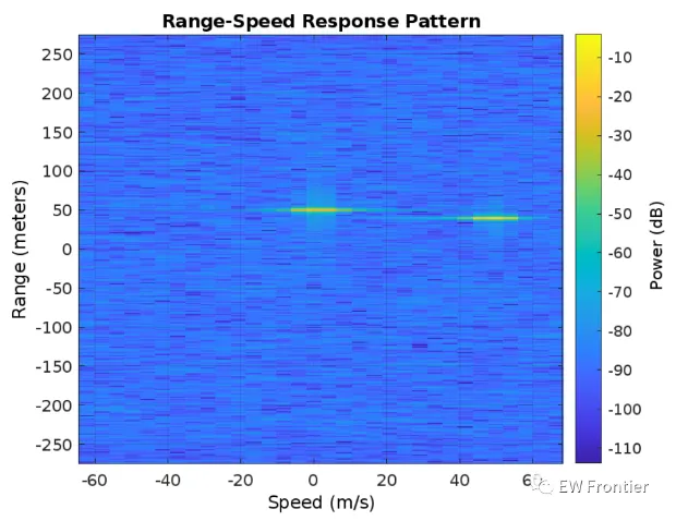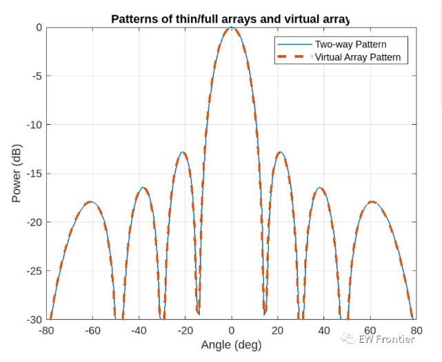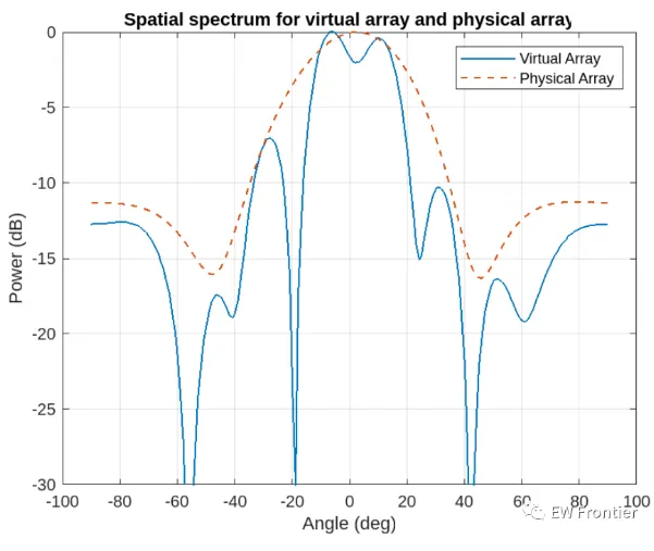 .rtcContent { padding: 30px; } .lineNode {font-size: 16pt; font-family: Menlo, Monaco, Consolas, "Courier New", monospace; font-style: normal; font-weight: normal; }%TDM MIMO Radar signal processing chain basicsfc = 77e9; %typical center freq for automotive radarsc = 3e8;lambda = c/fc;Nt = 2; %no of trasnmittersNr = 4; %no of recievers%defining array characteristicsdt = Nr*lambda/2; %thin array spacingdr = lambda/2; %full array spacingtxarray = phased.ULA(Nt,dt);rxarray = phased.ULA(Nr,dr);ang = -90:90; %field of view (FOV)pattx = pattern(txarray,fc,ang,0,'Type','powerdb');patrx = pattern(rxarray,fc,ang,0,'Type','powerdb');pat2way = pattx+patrx;%Demonstrating the equivalence of the two-way pattern this system %with a virual array of Nt * Nr elements varray = phased.ULA(Nt*Nr,dr);patv = pattern(varray,fc,ang,0,'Type','powerdb');figure(1)helperPlotMultipledBPattern(ang,[pat2way patv],[-30 0],... {'Two-way Pattern','Virtual Array Pattern'},... 'Patterns of thin/full arrays and virtual array',... {'-','--'},[1 2]);%TDM-MIMO Radar Simulation%Defining Waveformwaveform = helperDesignFMCWWaveform(c,lambda);fs = waveform.SampleRate;tm = waveform.SweepTime;sig = waveform();figure(2)subplot(211); plot(0:1/fs:tm-1/fs,real(sig));xlabel('Time (s)'); ylabel('Amplitude (v)');title('FMCW signal'); axis tight;subplot(212); spectrogram(sig,32,16,32,fs,'yaxis');title('FMCW signal spectrogram');%Radar System Setup%only main components are modeled and the effects from other components%are omitted, such as coupler and mixer. % In addition, the antenna is assumed to be isotropic.transmitter = phased.Transmitter('PeakPower',0.001,'Gain',36);receiver = phased.ReceiverPreamp('Gain',40,'NoiseFigure',4.5,'SampleRate',fs);txradiator = phased.Radiator('Sensor',txarray,'OperatingFrequency',fc,... 'PropagationSpeed',c,'WeightsInputPort',true);rxcollector = phased.Collector('Sensor',rxarray,'OperatingFrequency',fc,... 'PropagationSpeed',c);%The Radar has two cars in the FOV with a separation of 20 degrees%Define position and motion of the ego vehicle and the two cars in the FOVradar_speed = 100*1000/3600; % Ego vehicle speed 100 km/hradarmotion = phased.Platform('InitialPosition',[0;0;0.5],'Velocity',[radar_speed;0;0]);car_dist = [40 50]; % Distance between sensor and cars (meters)car_speed = [-80 96]*1000/3600; % km/h -> m/scar_az = [-10 10];car_rcs = [20 40];car_pos = [car_dist.*cosd(car_az);car_dist.*sind(car_az);0.5 0.5];cars = phased.RadarTarget('MeanRCS',car_rcs,'PropagationSpeed',c,'OperatingFrequency',fc);carmotion = phased.Platform('InitialPosition',car_pos,'Velocity',[car_speed;0 0;0 0]);%Channel model is assumed to be free space.channel = phased.FreeSpace('PropagationSpeed',c,... 'OperatingFrequency',fc,'SampleRate',fs,'TwoWayPropagation',true);%Generating the radar data cube recieved by the radarrng(2017);Nsweep = 64;Dn = 2; % Decimation factorfs = fs/Dn;xr = complex(zeros(fs*waveform.SweepTime,Nr,Nsweep));w0 = [0;1]; % weights to enable/disable radiating elementsfor m = 1:Nsweep % Update radar and target positions [radar_pos,radar_vel] = radarmotion(waveform.SweepTime); [tgt_pos,tgt_vel] = carmotion(waveform.SweepTime); [~,tgt_ang] = rangeangle(tgt_pos,radar_pos); % Transmit FMCW waveform txsig = transmitter(sig); % Toggle transmit element w0 = 1-w0; txsig = txradiator(txsig,tgt_ang,w0); % Propagate the signal and reflect off the target txsig = channel(txsig,radar_pos,tgt_pos,radar_vel,tgt_vel); txsig = cars(txsig); % Dechirp the received radar return rxsig = rxcollector(txsig,tgt_ang); rxsig = receiver(rxsig); dechirpsig = dechirp(rxsig,sig); % Decimate the return to reduce computation requirements for n = size(xr,2):-1:1 xr(:,n,m) = decimate(dechirpsig(:,n),Dn,'FIR'); endend%converting the radar data cube generated from the physical array%to the one formed using the virtual arrayxr1 = xr(:,:,1:2:end); %cube recieved by first transmit antennaxr2 = xr(:,:,2:2:end); %cube recieved by first transmit antennaxrv = cat(2,xr1,xr2); %virtual radar data cube%performing range-Doppler processing on the virtual data cube.nfft_r = 2^nextpow2(size(xrv,1));nfft_d = 2^nextpow2(size(xrv,3));rngdop = phased.RangeDopplerResponse('PropagationSpeed',c,... 'DopplerOutput','Speed','OperatingFrequency',fc,'SampleRate',fs,... 'RangeMethod','FFT','PRFSource','Property',... 'RangeWindow','Hann','PRF',1/(Nt*waveform.SweepTime),... 'SweepSlope',waveform.SweepBandwidth/waveform.SweepTime,... 'RangeFFTLengthSource','Property','RangeFFTLength',nfft_r,... 'DopplerFFTLengthSource','Property','DopplerFFTLength',nfft_d,... 'DopplerWindow','Hann');[resp,r,sp] = rngdop(xrv);%the range-Doppler map for the first element in the virtual arrayfigure(3)plotResponse(rngdop,squeeze(xrv(:,1,:)));%performing detection using a manual threshold deduced from%the range-doppler maprespmap = squeeze(mag2db(abs(resp(:,1,:))));ridx = helperRDDetection(respmap,-10);%extracting range cuts of targets for further spatial processingxv = squeeze(sum(resp(ridx,:,:),1))';doa = phased.BeamscanEstimator('SensorArray',varray,'PropagationSpeed',c,... 'OperatingFrequency',fc,'DOAOutputPort',true,'NumSignals',2,'ScanAngles',ang);[Pdoav,target_az_est] = doa(xv);fprintf('target_az_est = [%s]\n',num2str(target_az_est));%demonstrating angular resolution improvment achieved by virtual arraydoarx = phased.BeamscanEstimator('SensorArray',rxarray,'PropagationSpeed',c,... 'OperatingFrequency',fc,'DOAOutputPort',true,'ScanAngles',ang);Pdoarx = doarx(xr);figure(4)helperPlotMultipledBPattern(ang,mag2db(abs([Pdoav Pdoarx])),[-30 0],... {'Virtual Array','Physical Array'},... 'Spatial spectrum for virtual array and physical array',{'-','--'});