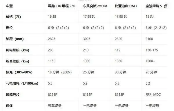 先说说零跑C16,这款车算是这个价位里的“全能选手”,没什么明显短板,主打一个均衡。2026款早就上市了,价格从15.18万到18.98万,刚好卡在大多数家庭的预算里。最贴心的是它给了两个选择,怕续航焦虑的,直接冲增程版,纯电能跑280公里,平时上下班、接娃买菜,基本不用沾油;真要出远门,发动机补能,综合续航轻松破千,而且支持800V高压快充,30%充到80%也就19分钟,喝杯咖啡的功夫就能满血复活。