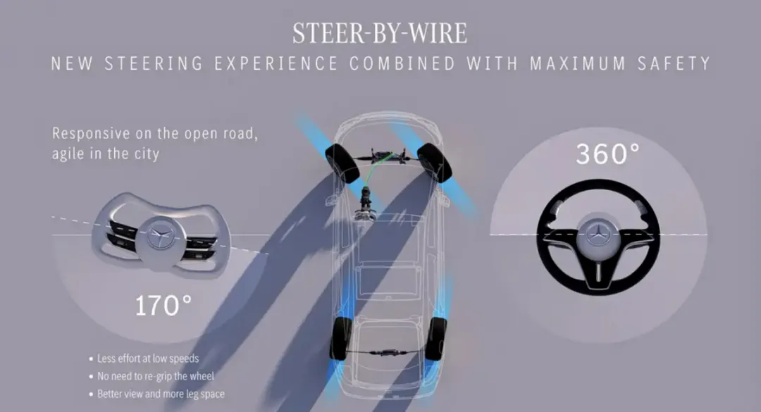 所以新款EQS全面引入线控转向技术,彻底取消了现款车型方向盘与转向机构之间的机械连接,采用纯电控信号传递转向指令。这套系统配备双重信号冗余设计,已完成100万公里可靠性测试,兼顾了操控体验与安全保障。