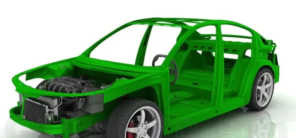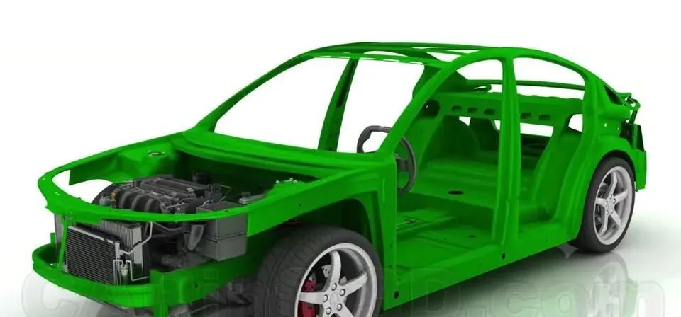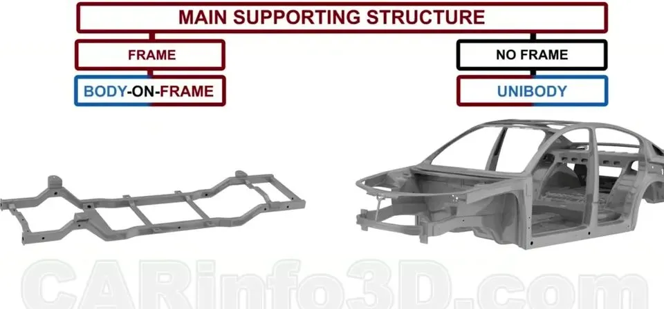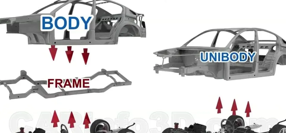 家用车用的是另外一种结构——承载式车身。整个车身骨架就是一个整体,发动机、变速箱、底盘件等等都是直接安装在这个车身骨架上的。