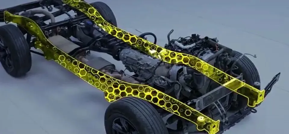 那这个大梁到底是什么?你想一下,有大梁的车,这个大梁也叫纵梁,纵向穿过整个车身,发动机、变速箱、底盘件,全部都是安装在这两根纵梁上的。我们的驾驶舱,其实就是一个车壳子盖在上面。