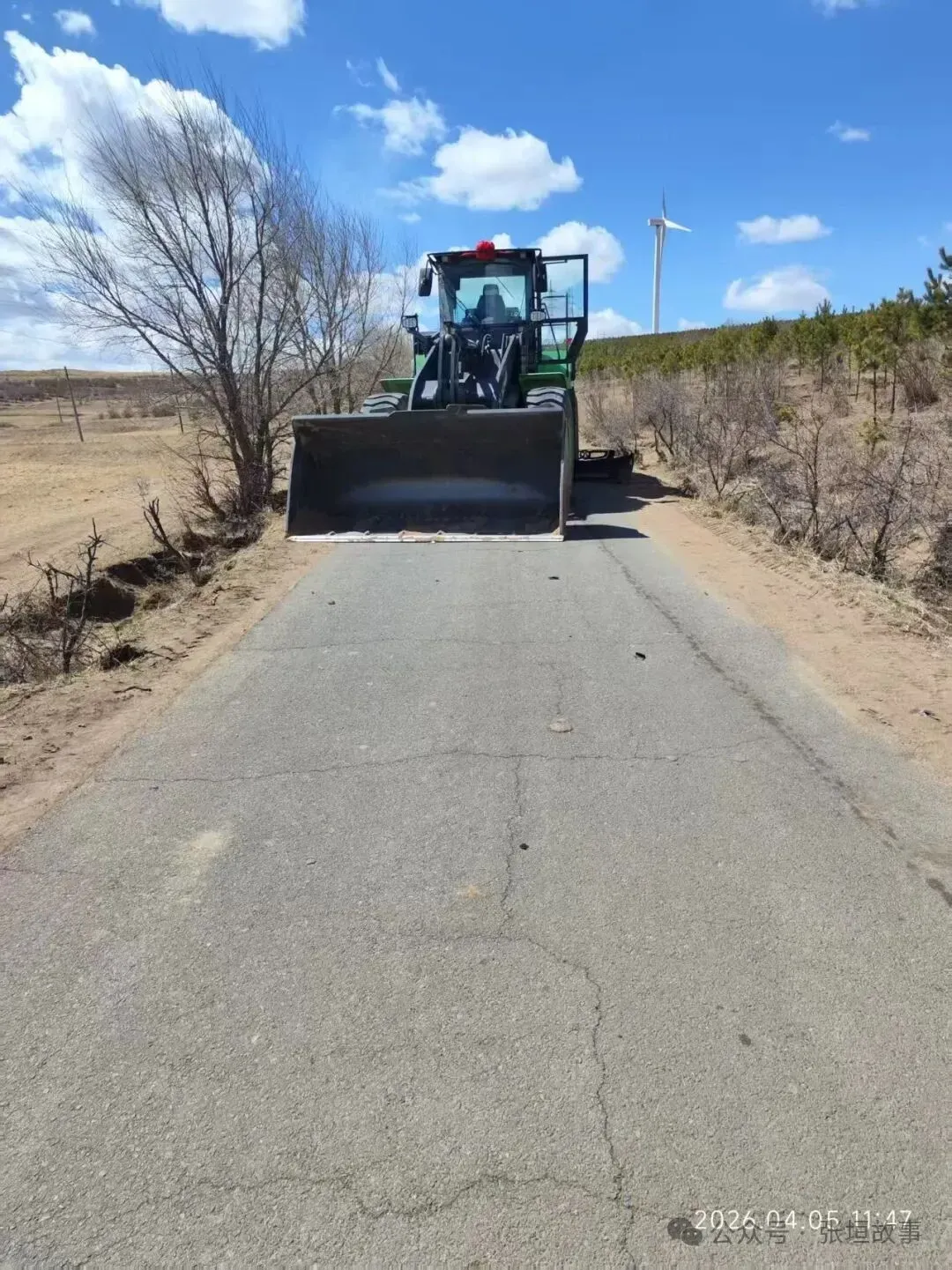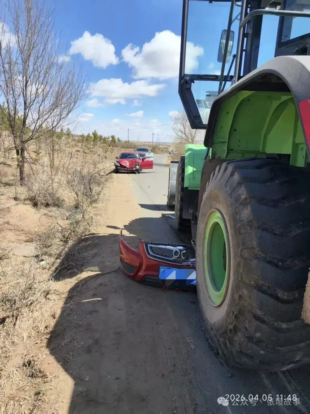 4月5日上午,张家口张北县大西湾乡去往徐大保、胡达赖的路上(陡坡路),一辆工程铲土车与一辆红色小轿车相撞,红色轿车受损严重,途径此路车辆纷纷掉头绕行。