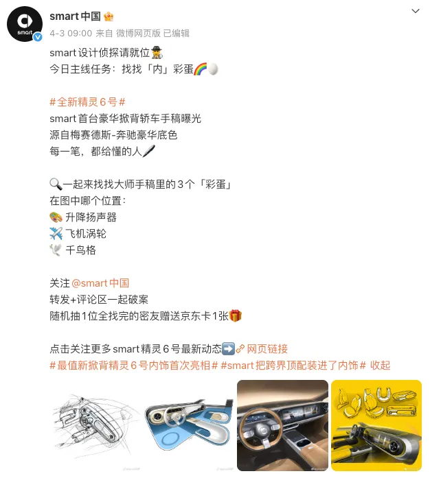 4.【smart首台豪华掀背轿车,精灵6EHD内饰手稿公布】smart近日公布旗下首台豪华掀背轿车内饰手稿,号称“源自梅赛德斯-奔驰豪华底色”。手稿中有三个“彩蛋”,分别为升降扬声器、飞机涡轮、千鸟格。(汽车之家)