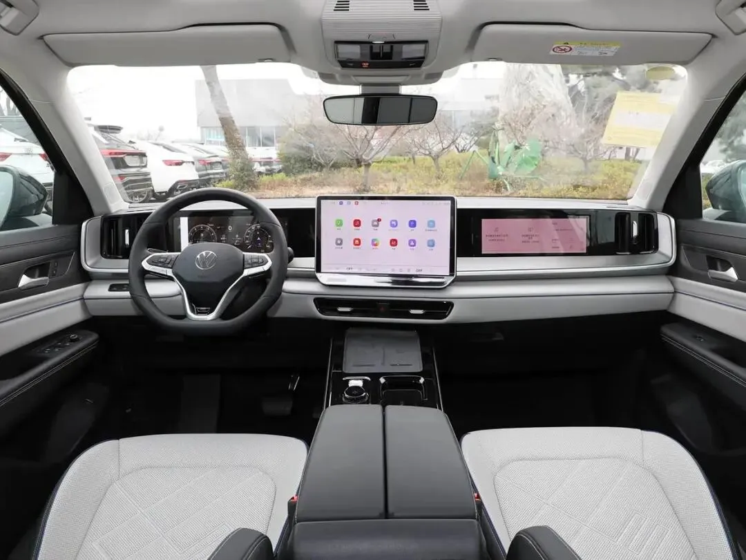 进入车内,内饰采用大众最新数字化豪华座舱,环抱式布局 + 焕新升级材质,豪华感与科技感双在线。中控台分层设计,搭载10.25 英寸全液晶仪表 + 12 英寸悬浮式中控屏双联屏,搭载最新 MOS 4.0 智能车机系统,支持 5G、AR 导航、全场景语音交互、OTA 升级、无线 CarPlay/HiCar,操作流畅、功能全面,语音控制覆盖导航、空调、座椅、娱乐等全场景,盲操作便捷。空间方面,2980mm 轴距带来越级大五座空间,后排腿部空间两拳以上,头部空间一拳四指,中间地台纯平,满载 3 人无局促感;后备箱常规容积 656L,后排座椅 4/6 比例放倒后可拓展至 1920L。
