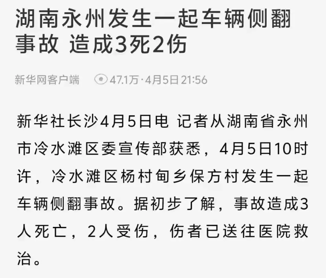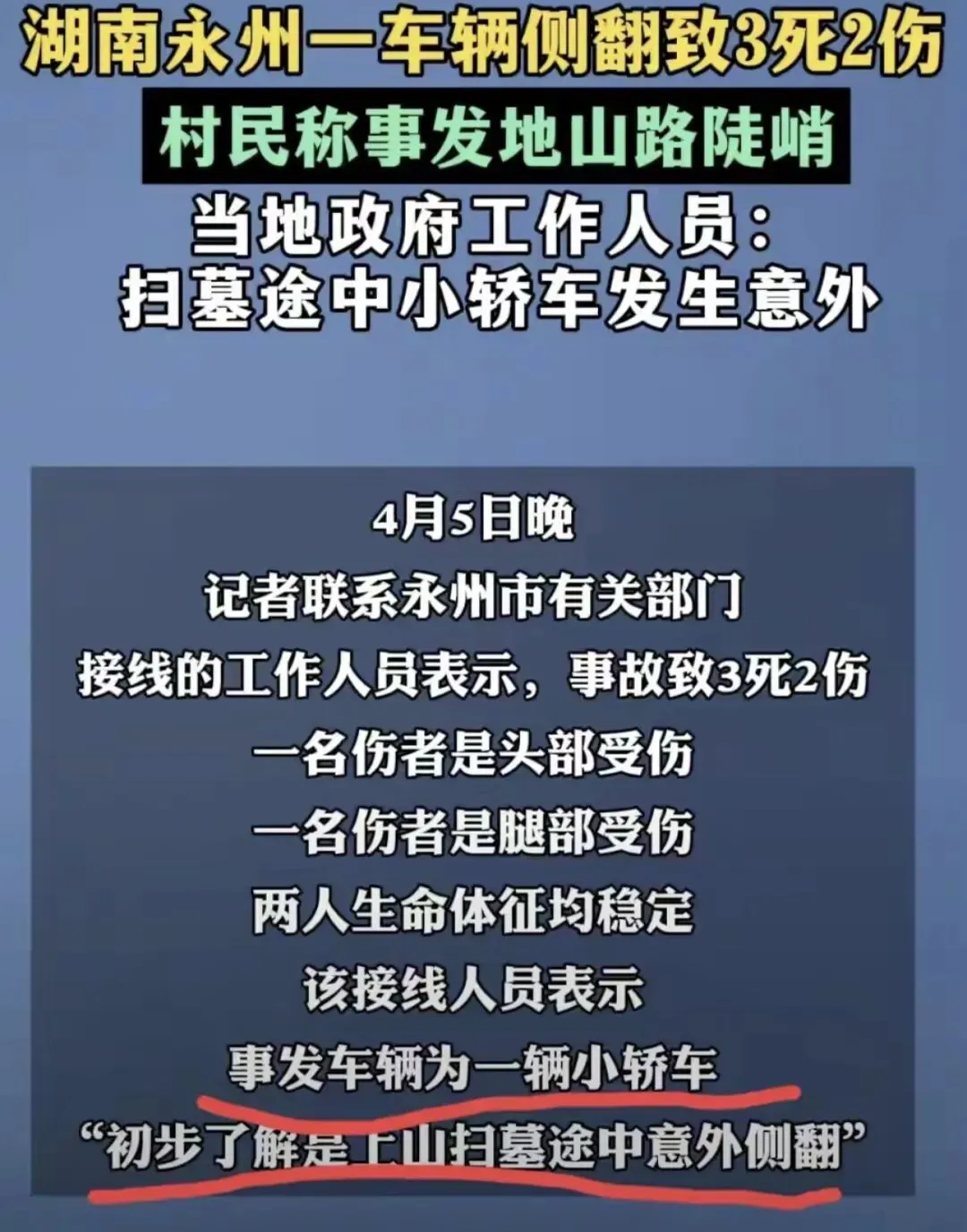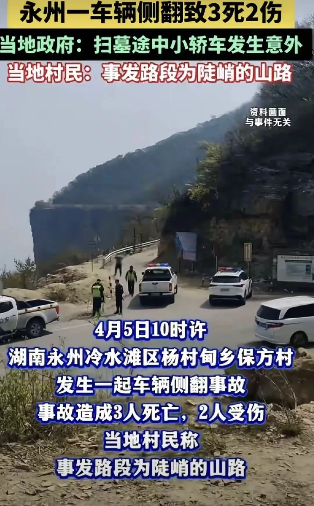 这件事情真的令人太痛心了,清明节本来是寄托哀思的日子,但是湖南永州的一家人,却在去扫墓的路上出了大事。2026年4月5日上午10点多,一名男子开车带着家人去山上扫墓,结果车子开到半山腰的时候,突然侧翻滚了下去,最终造成3人遇难、2人受伤。