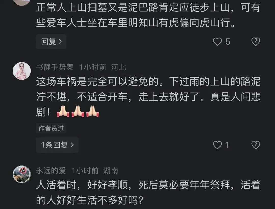 这件事在网上也引起了网友的热议,一部分网友称,清明去上个坟,结果一家人就这样没了,太让人惋惜了;还有不少网友表示,路不好就不应该冒险,做什么事情都要把完全放在第一位,希望能引以为戒吧。对此,你们怎么看呢?