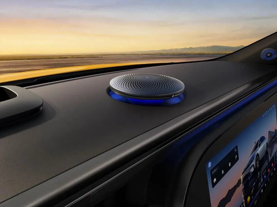 首先来看内饰,新车内饰依旧采用家族式设计风格,提供格律黄、玄影黑和原野棕三种内饰配色选择。中控台采用整体贯穿式的中控台造型,包含内嵌式矩形全液晶仪表盘,以及中控屏+副驾娱乐屏的双联屏设计,并且双联屏的边框还采用家族式胶囊设计元素。车门面板上将会有千鸟格图案点缀,空调出风口则采用圆形+十字扇叶的组合,类似于飞机涡轮造型。此外,新车中控台中央配备可升降扬声器,同时中岛区域带有手机无线充电面板以及横置的开放式杯架,车内配备近800处灯光点位,26处氛围灯支持256色自定义。