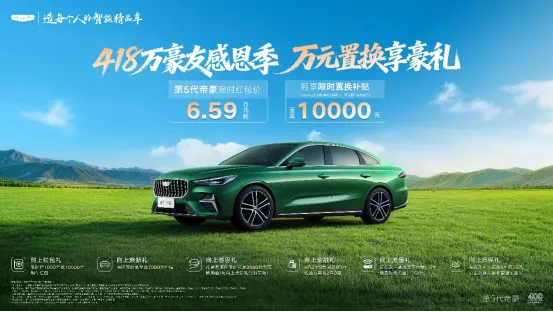 4月购第5代帝豪,限时享至高10000元置换补贴,还可叠加享受国补,限时红包价6.59万元起,更有4万2年0息贷款或7年优选方案前2年0息,首任车主基础流量免费,3年免费娱乐流量(10G/月),整车及动力总成4年或15万公里质保(限非营运车主)。颜值与实力兼得,这才是真正的“国民豪华车”!