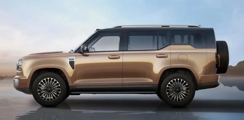车身侧面造型轮廓方正,车顶带有行李架,高位式的车身腰线简洁平直,外凸的轮眉是车身同色的涂装,使用了黑色涂装的车身下护板。