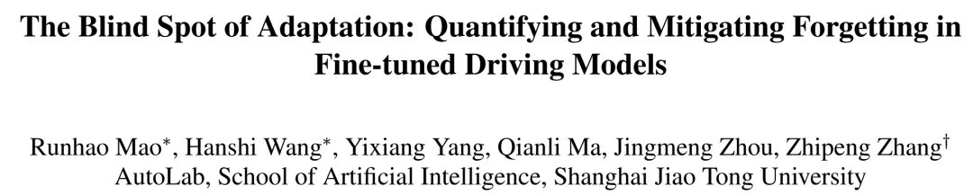 <The Blind Spot of Adaptation: Quantifying and Mitigating Forgetting in Fine-tuned Driving Models>论文:https://arxiv.org/pdf/2604.04857代码:https://github.com/AutoLab-SAI-SJTU/FidelityDrivingBench一、研究方向及背景