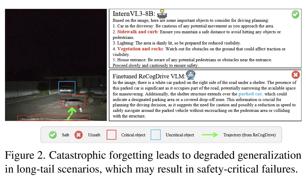 论文首先指出,当前很多自动驾驶VLM方法只关注任务性能提升,却忽视了微调导致的知识退化。作者在文中展示了一个很直观的例子:基础模型原本还能识别路边石块、路缘等关键风险物,但微调后的驾驶模型反而漏检这些危险目标,导致潜在不安全轨迹(见图2)。这说明,模型虽然“更像驾驶模型了”,却可能“更不懂世界了”。