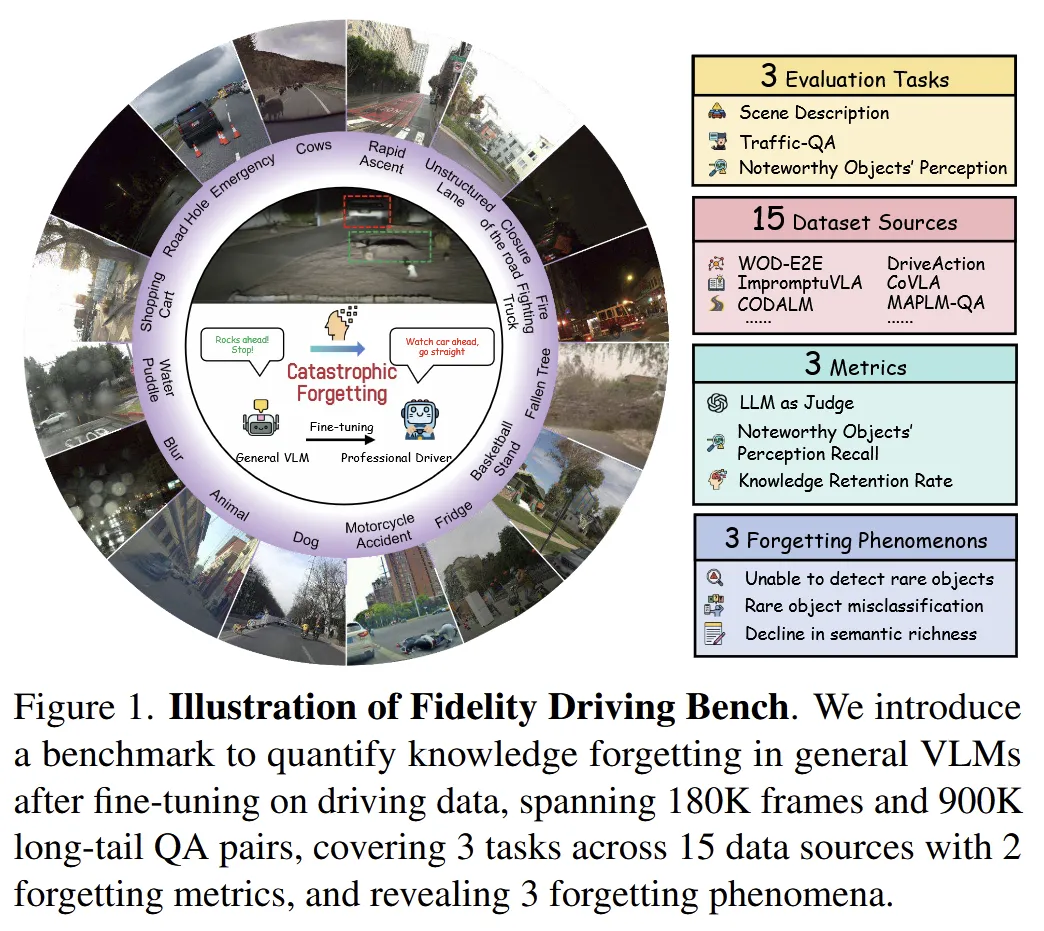 论文最重要的创新之一,是提出了 Fidelity Driving Bench。按照作者的描述,该基准覆盖 15个数据源、18万 driving scenes、90万 QA 对,并设计了 3类评测任务 与 2类核心遗忘指标,用于专门分析微调后的知识保留问题(见图1)。