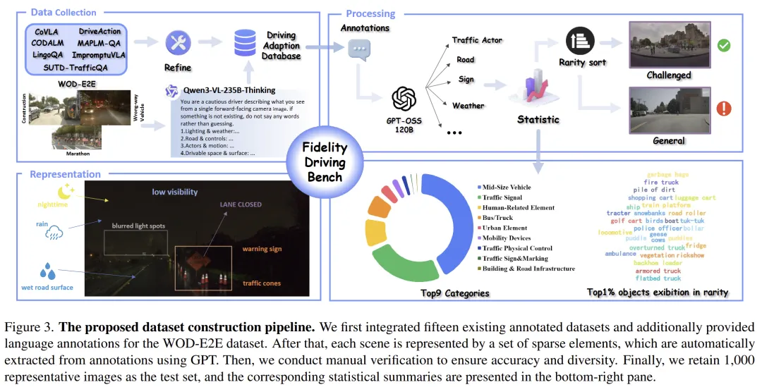 同时,作者还把剩余数据整理成高质量训练集,最终形成了一个 180K 场景、15个来源、900K QA 的统一训练语料。论文在表1中将其与 DriveLM、CoVLA、OmniDrive、ImpromptuVLA 等数据集做了比较,可以看到 Fidelity Driving Bench 在场景规模、数据来源多样性上都更强。
