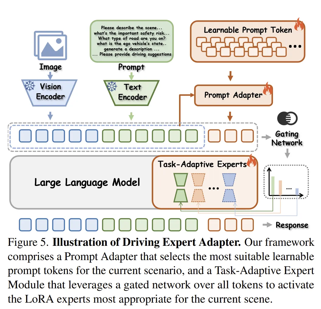 仅靠 prompt 还不够,因为简单 LoRA 虽保留了一些知识,但对复杂长尾场景的能力提升有限。为此,作者加入 任务自适应专家模块 TAEM。它本质上是一个面向驾驶场景的动态专家系统,不同专家分别适合不同驾驶状态,如拥挤路口、并线、高速、低能见度天气等;再由一个 gating network 根据场景线索和 prompt 语义选择合适专家。这个设计使模型不必用一个统一小模块去应对所有复杂情况,而能做到“按场景调专家”。这一结构在图5中有清晰示意。
